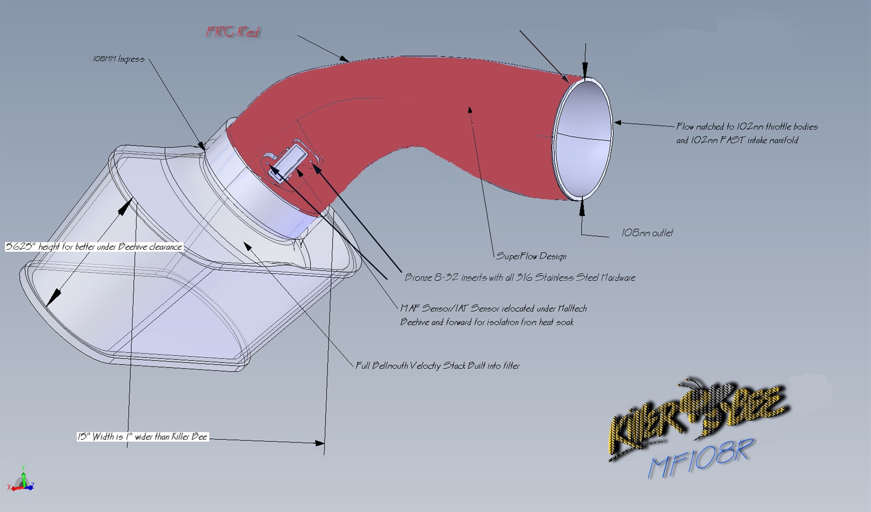 Halltech Killer Bee MF108R is the world champ induction system for your LS7 or LS3.  CAD designed, Red XLPE poly construction, bronze 8-32 nutcerts, coming out of our all new 7075T6 billet mold for a perfect red finish to match your LS7 Fuel Rail Covers.  This intake has recently laid down 615.2 RWHP/580.4lb-ft torque on the Lethal Racing dyno.  It helped two competitors run 9.97 @137.42 for a bolt on only Z06, and 9.82 for a bolt on Z06 with a cam only, stock heads.  Want more?  So do we, so get in line for yours.  We will be testing this intake soon along side the new MSD intake manifold.  Order today, and expect delivery right after Thanksgiving. Re-translating the MAF code is imperative.  Now with 316 Stainless Steel 8-32 MAF screws and washers.  The picture is not the MF108, but is a close representation of the bridge.  This intake comes in Black as well.  Just indicate your preference in comments. Will not fit the C6 Z07 Carbon Edition.