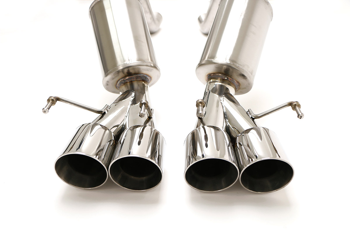 Fusion Cat Back Exhaust System. 4'' Quad ROUND Double-Wall Tips. Mandrel bent from the highest-grade T-304 stainless steel. Designed, tested, and manufactured to the finest hand-made integrity found in any exhaust system.
