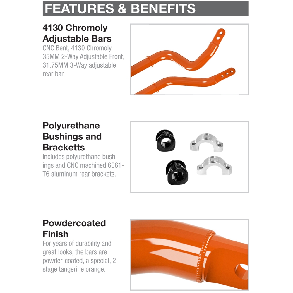 Features: CNC Bent, 4130 Chromoly 35MM 2-Way adjustable Front, 31.75MM 3-Way adjustable rear bar Polyurethane bushings and CNC machined 6061-T6 aluminum rear brackets Heavy duty, ½” Rod end endlinks, and CNC machined articulation spacers 2 Stage Tangerine Orange, Powder-coated finish Up to 1.25 inches of drop for the correct relation between looks and proper function Stainless Steel, CNC machined adjuster stud with wrench flats for years of durable service and corrosion resistance Articulating ball stud for perfect alignment between foot and stud Nylon, foot pads, for smooth articulation and quiet operation Direct Fit Installation, Requires No Modifications. Fits 2014-2015 C7 Corvette Stingray. |