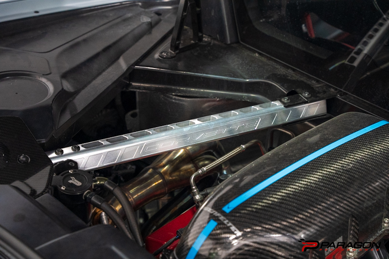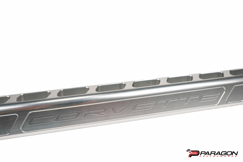 Upgrade the look of your engine bay with these solid billet 6061 aluminum Corvette strut tower support bars. Features machined cutout pockets for weight savings and exposed machined pockets for a striking appearance. Corvette text is machined into the bar to bring more GM branding to your engine bay. Includes brackets to retain your OEM EVAP line & mag ride wiring retainer (If applicable). - Fits Coupe and Convertible
