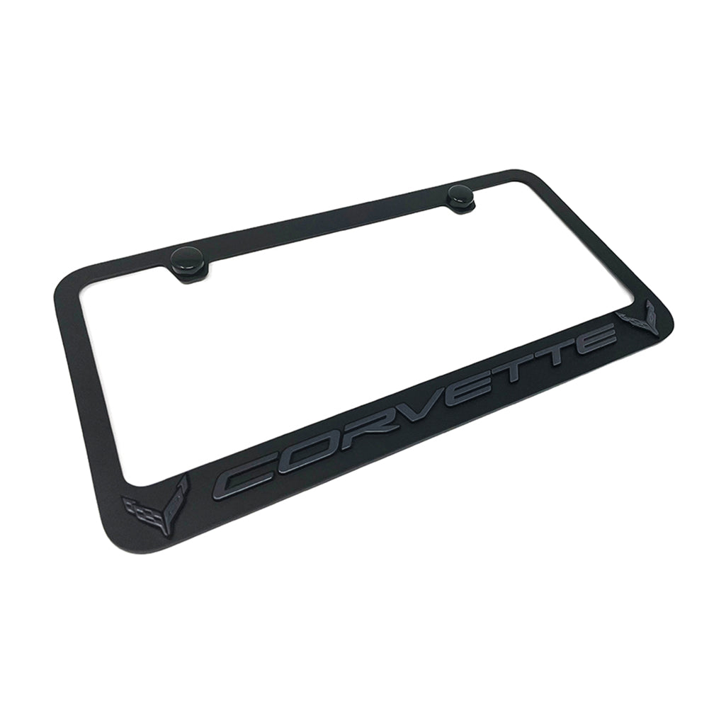 Black frame with Corvette Script and Crossed Flags logo on each side. The frame construction is a rust proof brass/zinc alloy with two-holes and a wide bottom design. Frame wording is laser-cut and hand assembled lettering.