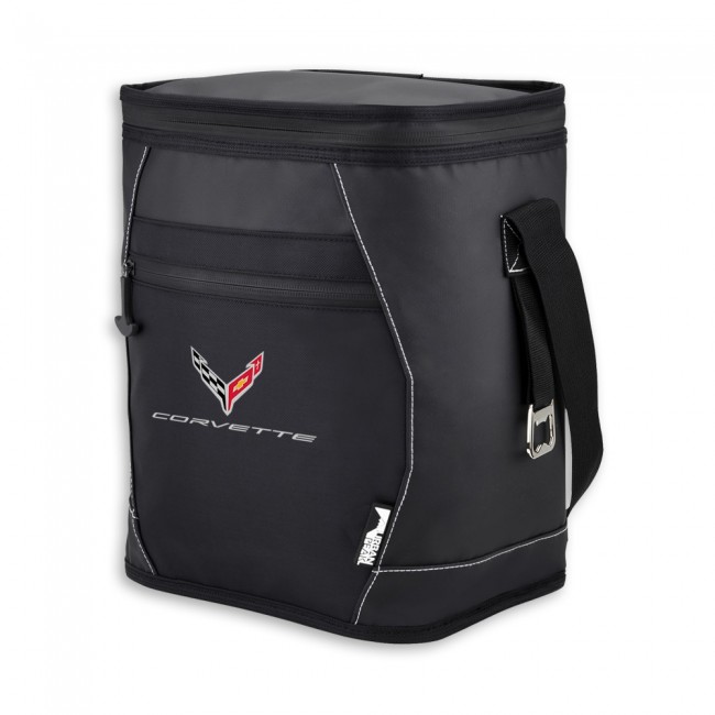 Rugged and waterproof top-loading 12 can cooler featuring thick foam insulation and leak-resistant heat-sealed liner. Features a main compartment, front zippered pocket, water-resistant zippers with easy-grip zipper pulls, a strap-secured stainless steel bottle opener, and an adjustable shoulder strap. Embroidered C8 crossed flags and signature on the front pocket. 1-year limited warranty. 12"H x 10"W x 7"D.