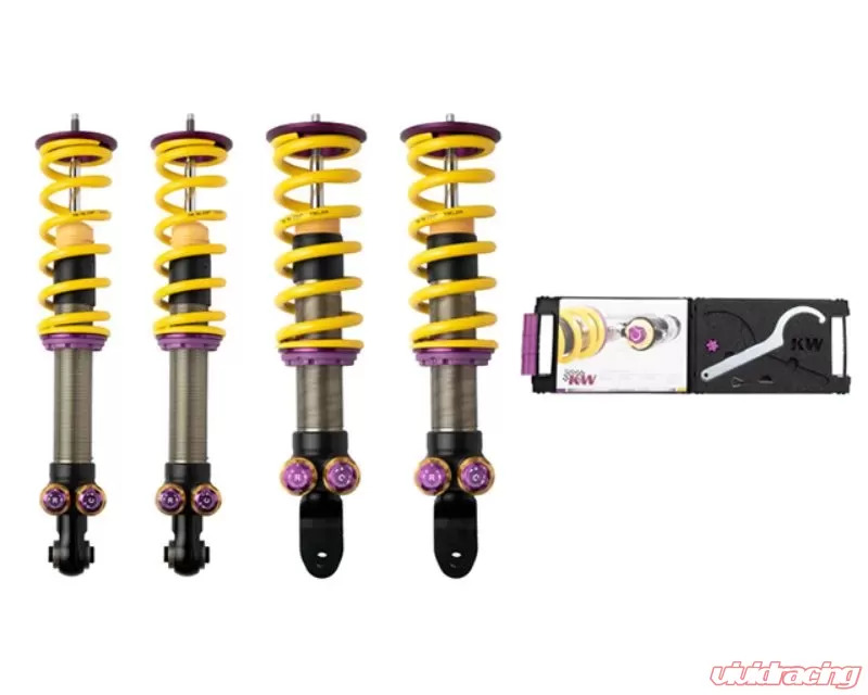 KW V5: The all new V5 coilover also features precise 4 way dampening adjustment capabilities. When you're looking to lower and improve your vehicle's suspension, having rebound and compression adjustment is great. But having the ability to fine tune your suspension movements at different speeds is even better. KW took the V5 coilover to a whole new level with high speed and low speed tunability. High speed refers to suspension travel and events that the coilover itself experiences very quickly such as a sharp corner or a hard launch from a stop. Low speed events refer to suspension movements that happen at a slower, more gradual pace such as large sweeping corners or gradual acceleration. Having the ability to adjust high and low speed suspension dampening independently gives you unprecedented handling, performance, and control. This means every acceleration, steering movement, or braking event is tunable and precise.