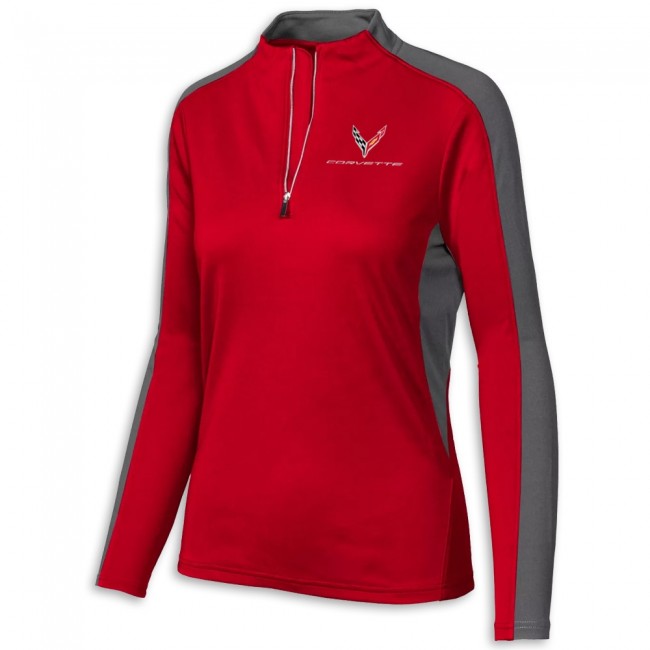 This quarter-zip pullover features quilted-knit contrast panels on the shoulder and sleeves for a unique and stylish look. Moisture-wicking, anti-static, jacquard knit with articulated sleeves. C8 Corvette crossed flags and signature on the left chest. 91% polyester/9% spandex.