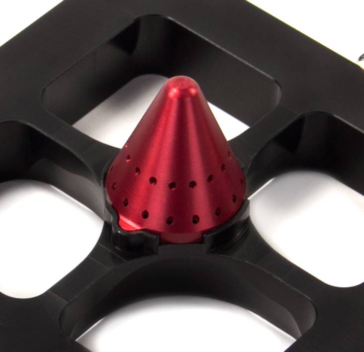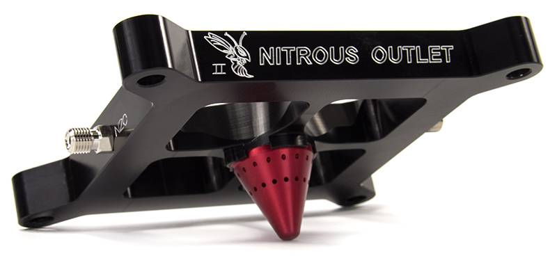 Construction: The 4150 plate and cone are manufactured from 6061 billet aluminum. The nitrous plate is .75 inch thick and black anodized with engraved Nitrous Outlet logos and Fuel/N2O entry marking. The cone is anodized red and features 16 nitrous discharge holes and 16 fuel discharge holes.