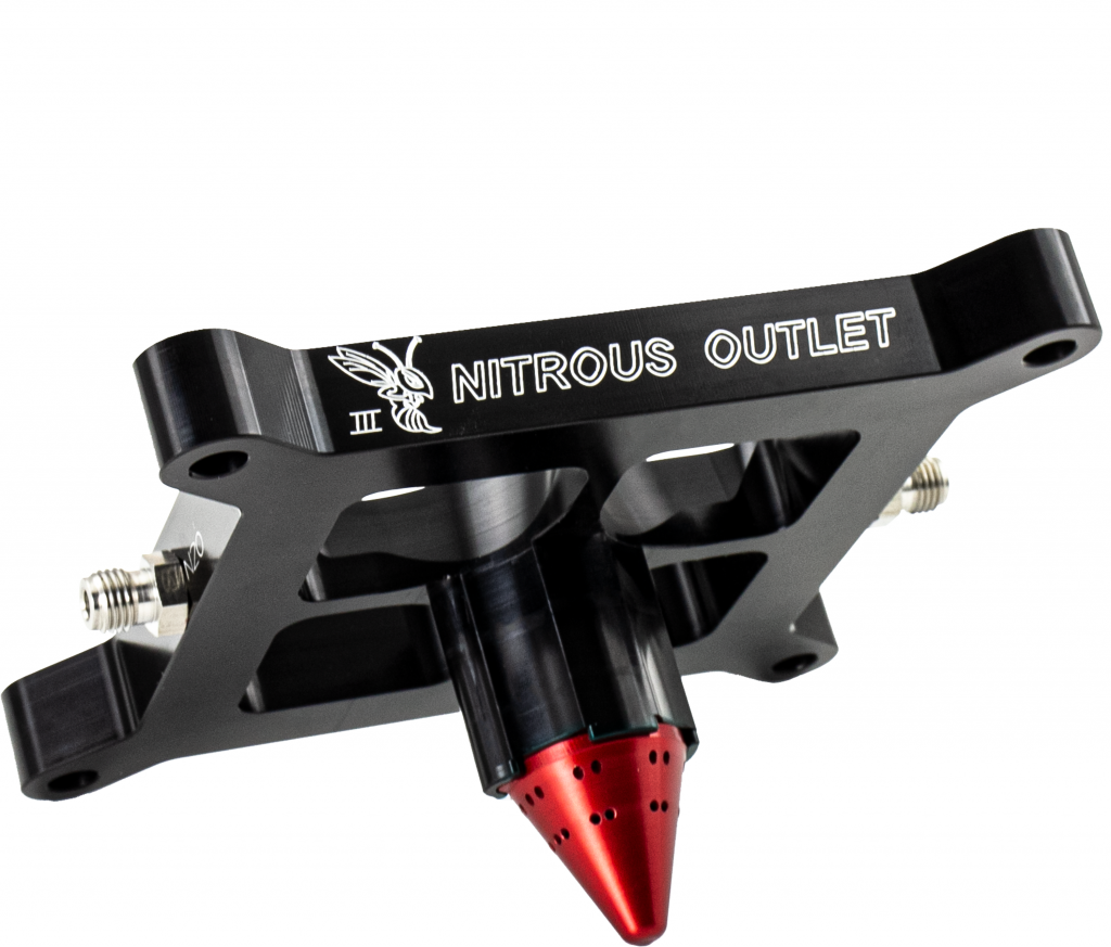 Construction: The 4150 plate and cone are manufactured from 6061 billet aluminum. The nitrous plate is .75 inch thick and black anodized with engraved Nitrous Outlet logos and Fuel/N2O entry marking. The cone is anodized red and features 16 nitrous discharge holes and 16 fuel discharge holes that discharge 1-7/8 inch below the carb flange.