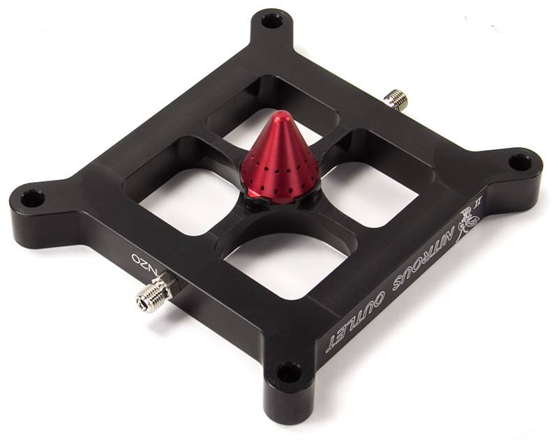 Construction: The 4150 plate and cone are manufactured from 6061 billet aluminum. The nitrous plate is .75 inch thick and black anodized with engraved Nitrous Outlet logos and Fuel/N2O entry marking. The cone is anodized red and features 16 nitrous discharge holes and 16 fuel discharge holes.