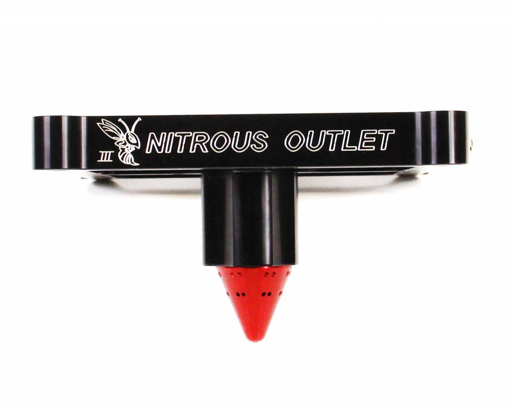Construction: The 4500 plate and cone are manufactured from 6061 billet aluminum. The nitrous plate is .75€ thick and black anodized with engraved Nitrous Outlet logos and N2O entry marking. The cone is anodized red and features 16 nitrous discharge holes that discharge 1-7/8" below the carb flange. Premium gaskets are included as well as Jetting for 50-100-150-200-250-300-350-400-450-500-550-600 horsepower shots. This is a dry race system and utilizes a .178 nitrous solenoid. Braided stainless hoses are included to connect the solenoids to the plate, as are universal solenoid brackets.
