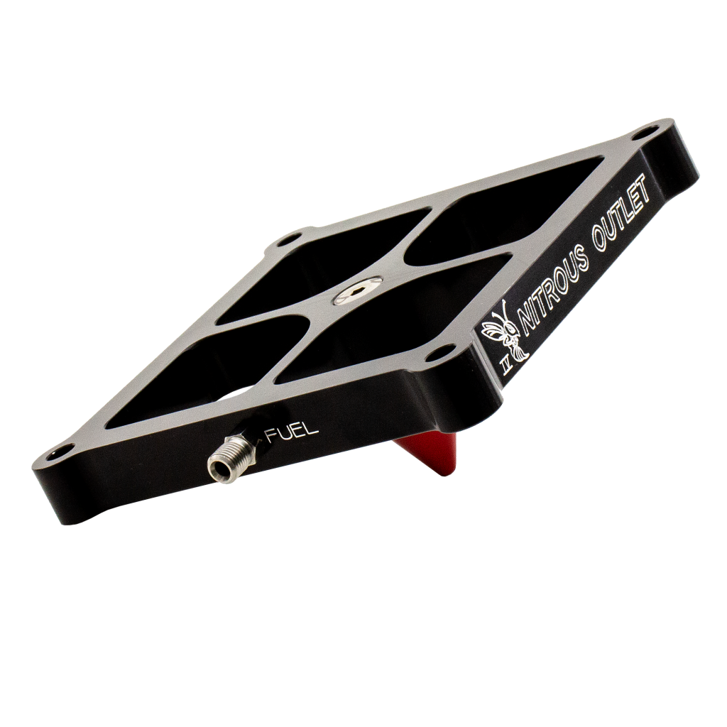 Design: The Stinger 2 is a single-entry nitrous plate that provides a max flow of 634hp. The fuel discharge ports are on top and discharge at a downward angle towards the horizontal nitrous discharge. The nitrous will mix into the air stream allowing the engine vacuum to pull it into the cylinder. This is a perfect plate for intake manifolds that do not have a tall deck height from the top of the runner to the carburetor flange.