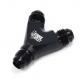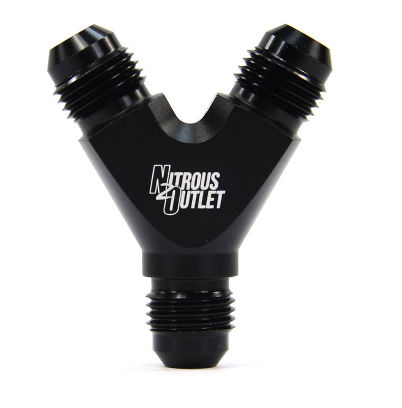 The Nitrous Outlet High Flow "Y" blocks are CNC machined for precise flow delivery and a nice clean look. Each distribution block is anodized black and laser etched with the Nitrous Outlet logo. This Y fitting has a 8AN inlet and two 6AN outlets. |