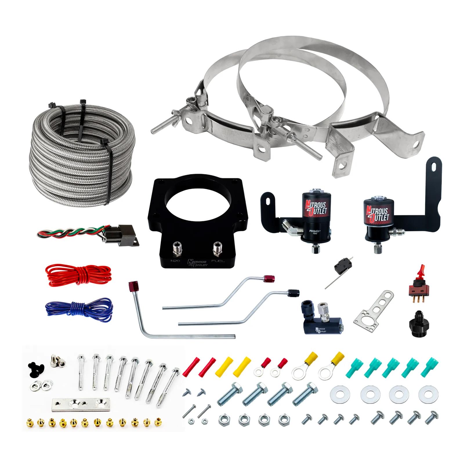 Complete System. This system includes all of the necessary components; billet aluminum nitrous plate, 50-200 HP jetting, hardware, and wiring to properly install a wet nitrous system on your vehicle.