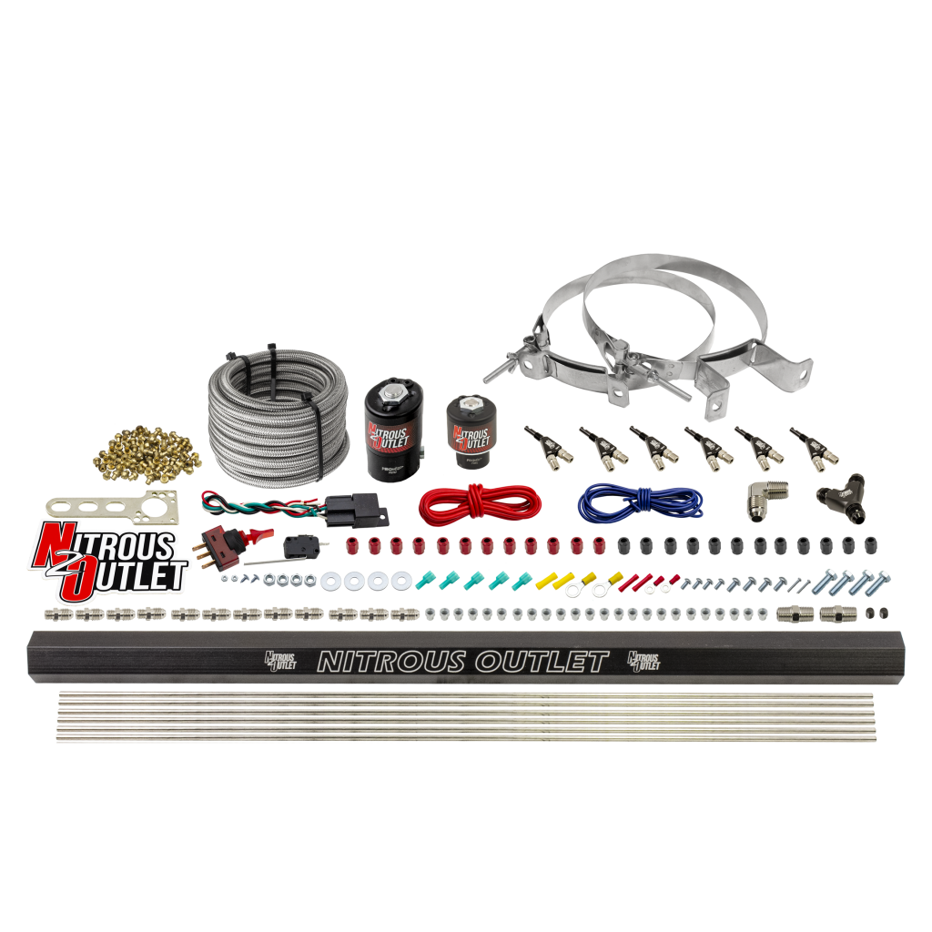 High Horsepower: Nitrous Outlet's 6 cylinder direct port systems are designed to be high flowing for high horsepower applications. This system comes with one wet 90° nozzle per cylinder capable of flowing up to 200 HP each.