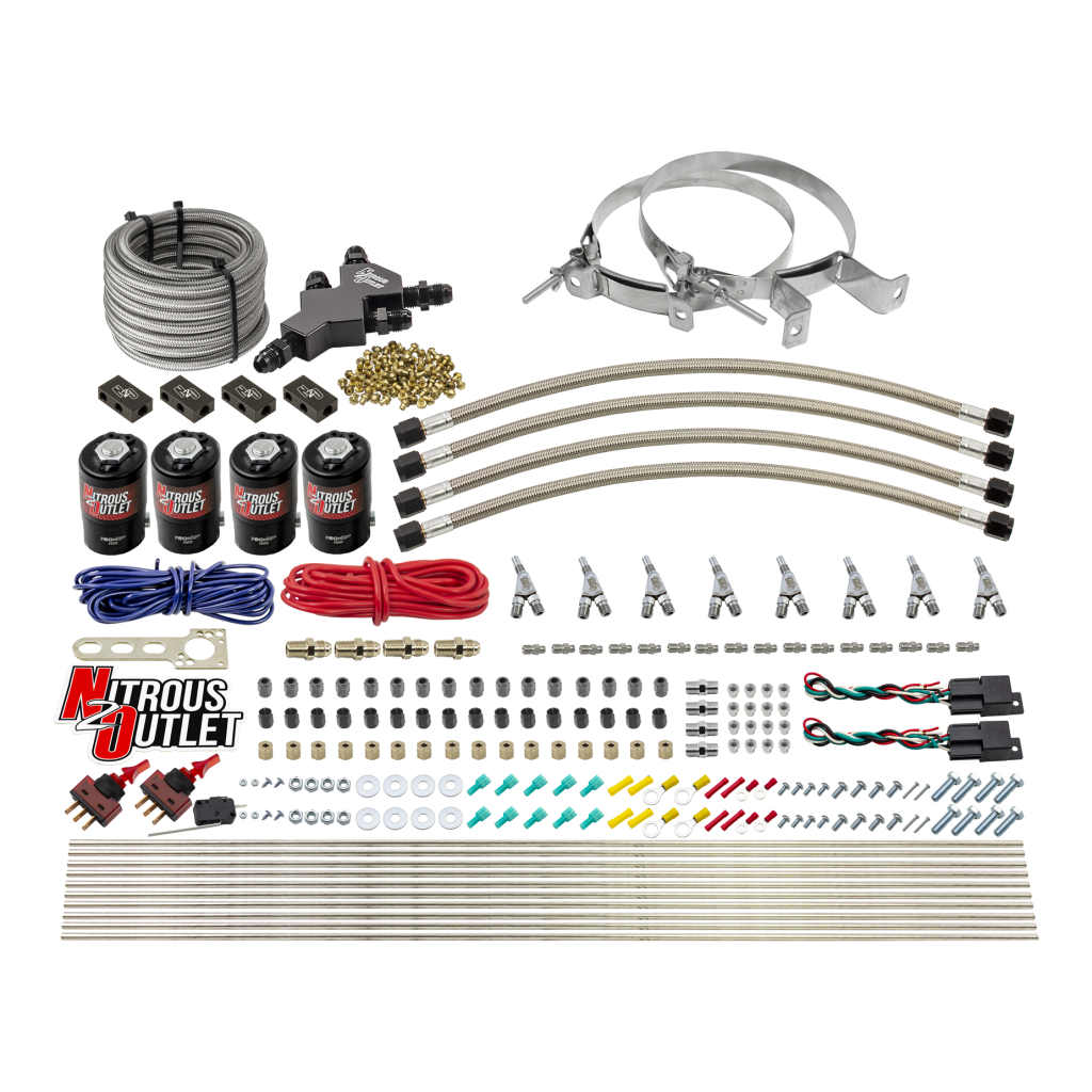 This system includes all of the necessary components; two .122 nitrous solenoids and two .177 fuel solenoids, 8 aluminum 90° nozzles, 20ft of hardline, all jetting, hardware, and electrical to install a direct port nitrous system capable of adding 800 HP per stage to your vehicle.