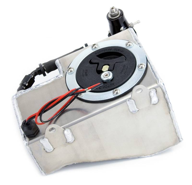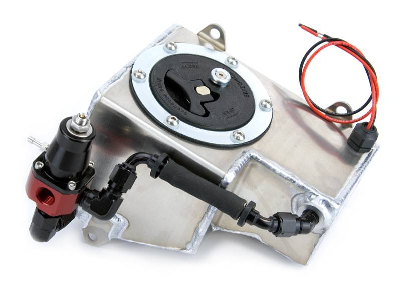 Heavy Duty Construction. Nitrous Outlet's dedicated fuel systems come complete with a custom built hand welded 0.63 gallon fuel cell, mounting brackets, E85 compatible in tank fuel pump, Aeromotive fuel regulator, Aeroquip 6 An hose, fuel lines, and fittings.