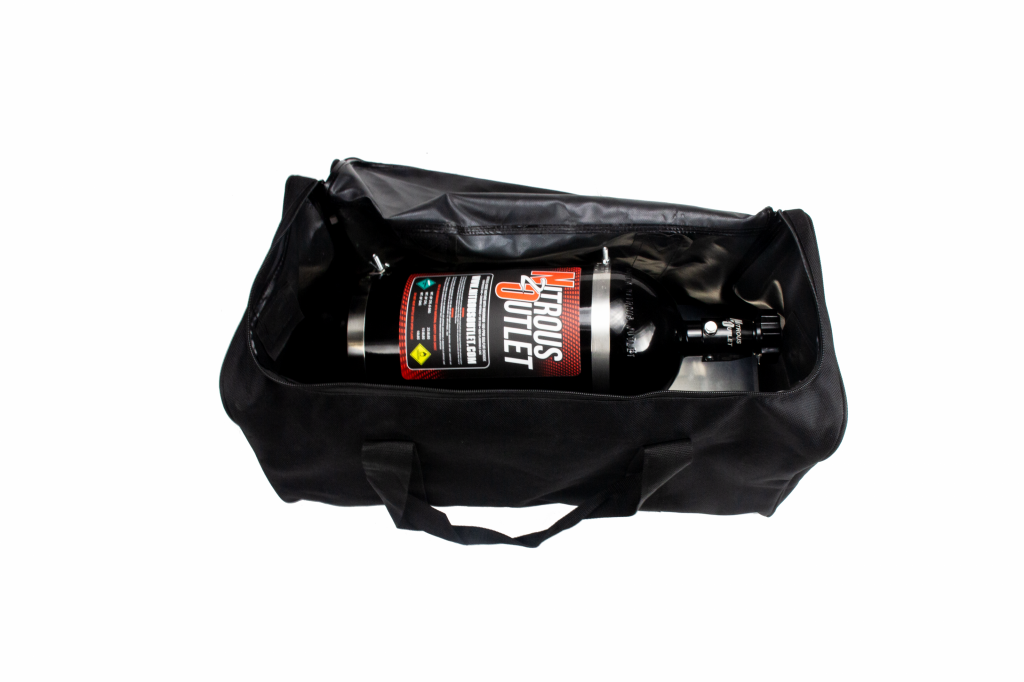 Premium Components: This nitrous kit utilizes a single aluminum 1-1/16" 90° dry nozzle and a US made nitrous solenoid with 3an hoses. The nitrous solenoid features a .078" orifice that can flow up to 200hp. The solenoid is attached to a custom universal laser cut bracket that is black powdercoated. Nitrous jets are included to allow you to spray 35, 50, 75, 100, 150, and 200hp! A 5lb bottle comes pre-attached to a laser cut 5052 Aluminum plate in a high-quality duffel bag for the ultimate stealthy appearance. A 120" 4an main feed line supplies the solenoid. We even go so far as to include a pre-terminated harness with alligator clips for the battery connection and a Deutsch connector at the solenoid. All you have to do is find a spot in the firewall to pass the harness through. The push button and cord are already wired in to the harness as well.