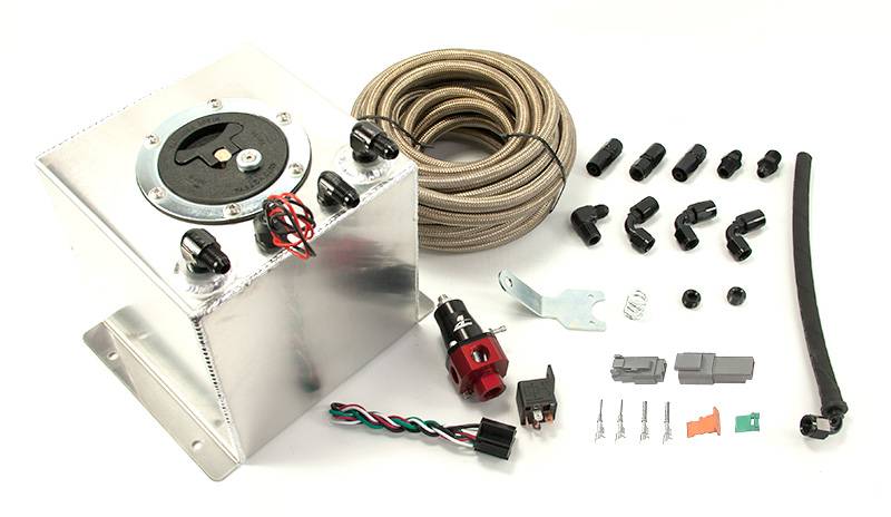 Heavy Duty Construction. Nitrous Outlet's dedicated fuel systems come complete with a custom built hand welded 3.13 gallon fuel cell, mounting brackets, E85 compatible in tank fuel pump, Aeromotive fuel regulator, Aeroquip 6 An hose, fuel lines, and fittings.