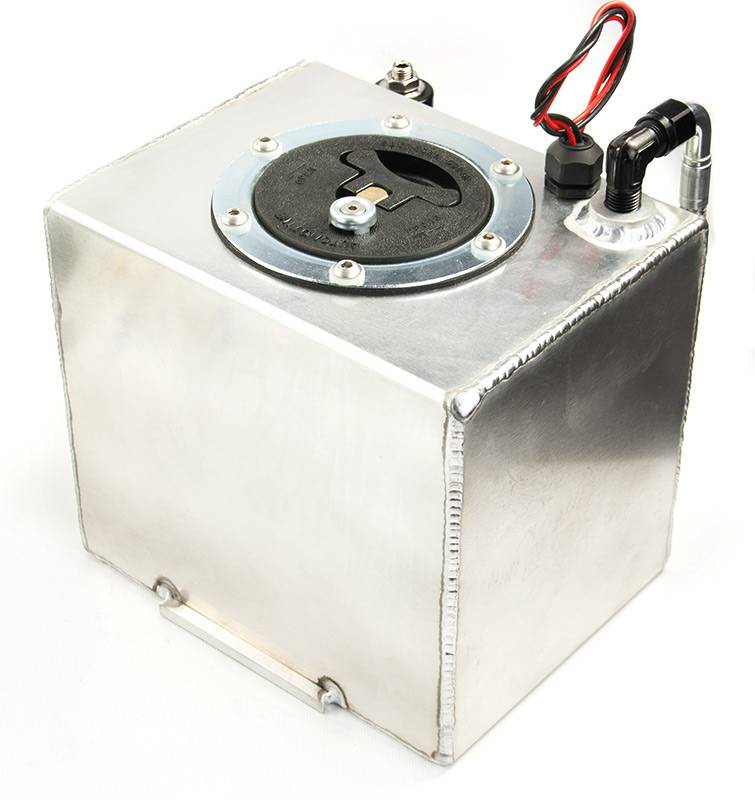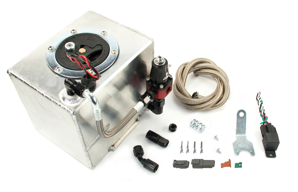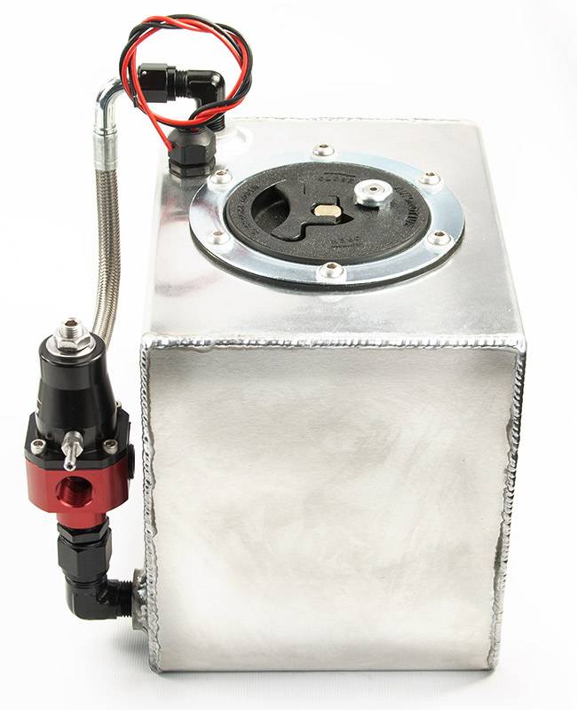 Heavy Duty Construction. Nitrous Outlet's dedicated fuel systems come complete with a custom built hand welded 2.07 gallon fuel cell, mounting brackets, E85 compatible in tank fuel pump, Aeromotive fuel regulator, Aeroquip 6 An hose, fuel lines, and fittings.