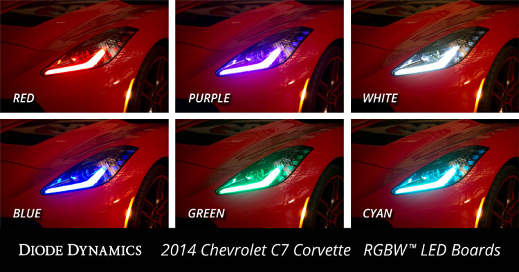 Full RGBW. Full multicolor, with no sacrifice. Convert the white LED accents inside your Corvette's headlights to illuminate in any color for a unique, custom look. Unlike other RGB products on the market that produce a mixed white color, our LED boards are RGBW, with independent White LEDs. After you have fun with colors, just select True White for a crisp, clean white output for everyday use.